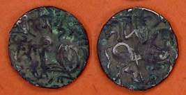 | Description / विवरण | Descrpn./Obv Recumbent bull facing left, wearing jhula (saddle cloth), with trisula (trident) symbol on rump. Above, legend in Sarada script Sri Samantadeva . Descrpn./Rev Rider with lance on caparisoned horse facing right. On left, Sarada letter bhi and on right, Sarada letter ta |
