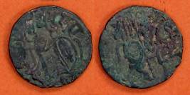 | Description / विवरण | Descrpn./Obv Recumbent bull facing left, wearing jhula (saddle cloth), with trisula (trident) symbol on rump. Above, legend in Sarada script Sri Samantadeva . Descrpn./Rev Rider with lance on caparisoned horse facing right. On left, Sarada letter bhi and on right, Sarada letter ta |