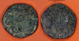 | Description / विवरण | Descrpn./Obv Recumbent bull facing left, wearing jhula (saddle cloth), with trisula (trident) symbol on rump. Above, legend in Sarada script Sri Samantadeva . Descrpn./Rev Rider with lance on caparisoned horse facing right. On left, Sarada letter bhi and on right, Sarada letter ta |