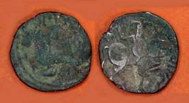 | Description / विवरण | Descrpn./Obv Recumbent bull facing left, wearing jhula (saddle cloth), with trisula (trident) symbol on rump. Above, legend in Sarada script Sri Samantadeva . Descrpn./Rev Rider with lance on caparisoned horse facing right. On left, Sarada letter bhi and on right, Sarada letter ta |