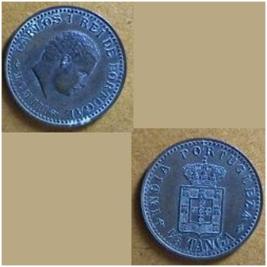 | Description / विवरण | Copper Coin - 1 8 Tanga Portuguese indigenous coin currency forEstado da India minated in copper Obv Bust of king Portugal with clockwise legend CARLOS-I REI DE PORTU- GAL MCM I Rev Portuguese royal emblem with crown and the cross, clockwise legend India Portuguesa and the denomination 1 8 Tanga. |