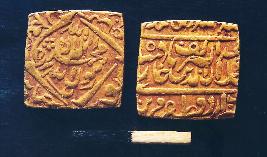 | Description / विवरण | Square shape gold coin of Mughal Emperor Akbar. On obverse In the circle Kalima. In the margin Ba sidq-i-Aba Bakr, ba adl-i-umar ba haya-i-Uthman, ba ilm-i-Ali. On reverse Jalalud-Din Muhammad Akbar Shah Ghazi khallad-Allahu Mulkahu Ta ala-979. Darb-i-Darul khilafat Agra. It is minted at Agra. |