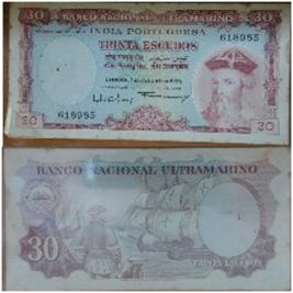 | Description / विवरण | Trinta Escudos-Portuguese overseas currency Note 30 - Dt.2nd January 1959. Printed on white paper in red, pink, light blue, light brown & light green colours. Obv Bust of Afonso de Albuquerque on the lower right side with the legend Banco Nacional Ultramarion, India Portuguese and the denominations in Portuguese Trinta Escudos in bold , Hindi, Devnagari & Urdu, serial number 618985 on the upper right & lower left side with the signatures of vice Governor & the Governor.The number denomination 30 is printed on all four corners of the note. |