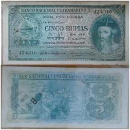 | Description / विवरण | Cinco Rupias- 5 - Portuguese overseas paper currency Cinco Rupias - 5 - with issue date Lisboa 29 de Novembro de 1945 printed white paper in - green and sky blue colours Identification - 14.2 cms 7.4 cms with denomination in vernacular characters Urdu, Hindi,Gujarathi and Kanada in Portuguese Cinco Rupias in bold upper character and other vernacular denomination 5 is printed on upper right and lower left corners. Rev Sea motifs - Ships arriving on the sea and a European lady looking - towards the ships from a Jetty, the legend Banco Nacional Ultramarino, - Pagavel Na India Portuguesa in bold upper character portuguese national emblem on the upper right side and the number denomination five in bold on the lower right and lower left corners. |