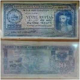 | Description / विवरण | Vinte Rupias - Rs. 20 - Portuguese overseas paper currency note Rs.20 - with issue Dt. 29th Nov. 1945 printed on white paper in blue and green Obv Bust of Afonso de Albuqerque, water mark with ship, the legend Ba- nco Nacional Ultramarino and India Portugusea in bold upper character, denomination in Portuguese - Vinte Rupias bold , denomination in verna cular characters - Urdu, Hindi, Gujarati and Kanada in the middle panel, signatures of vice Governor and the Governor on the lower part. Number denomination 20 on the upper right and lower left corner, serial number - 298767 on the upper right and lower left corner. Rev Fleet of ships on the sea, a European lady viewing the ship from a Jetty, decorative panel with Prtuguese emblem and number denomination 20 in bold on the right side, Banco Nacional Ultramarino on top. |