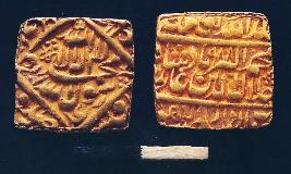 | Description / विवरण | Square shape gold coin of Mughal Emperor Akbar. Legend in Persian. On obverse In the circle Kalima. In the margin Ba sidq-i-Aba Bakr, ba adl-i-umar ba haya-i-Uthman, ba ilm-i-Ali. On reverse Jalalud-Din Muhammad Akbar Shah Ghazi khallad-Allahu Mulkahu Ta ala AH988. Darb-i-Darul khilafat Agra. It is minted at Lahore. |
