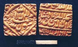 | Description / विवरण | Square shape gold coin of Mughal Emperor Akbar. Legend in Persian. On obverse In the circle Kalima. In the margin Ba sidq-i-Aba Bakr, ba adl-i-umar ba haya-i-Uthman, ba ilm-i-Ali. On reverse Jalalud-Din Muhammad Akbar Shah Ghazi khallad-Allahu Mulkahu Ta ala 988. Darb-i-Darul khilafat. Minted at Lahore. |