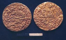 | Description / विवरण | Round gold coin of the Nawabs of Awadh, Nawab Mohammad Ali Shah. Legend is in Persian. On obverse Ba jud-o-karam sikka zad dar jahan Muhammad Ali Badshah-i-jahan 1254. On reverse Around the Emblem Sana 2 julus-i-maimanat manus Darb-i-Darus-Saltanat Lucknow. Date AH 1254, Regnal year 2 1838-39 AD. It is minted at Lucknow. |