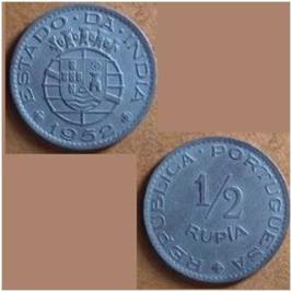 | Description / विवरण | Rupia coin Portuguese overseas Rupia coin for Estado da India state of India - minted in copper and nickel reliefs. Obv Denomination bold Rupia with clockwise legend REPUBLICA PORTUGUSEA. Rev Portuguese National Emblem with Busts of King and Queen, clock - wise legend EASTADO DA INDIA with the year on minting 1952. |