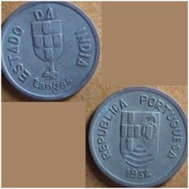 | Description / विवरण | A.C.N. 4 Tangas 1934 Portuguese overseas coin currency 4 Tangas for ESTADO DA INDIA state of India minted in copper and nickel reliefs. Obv Portuguese National Emblem clockwise legend EASTADO DA INDIA and the denomination 4 Tangas. Rev Portuguese National Emblem with a monogram,clockwise legend - REPUBLICA PORTUGUESA with year of minting 1934 |