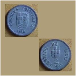| Description / विवरण | A.C.N. 2 Tangas 1934 Portuguese overseas coin currency 2 Tangas for ESTADO DA INDIA state of India minted in copper and nickel reliefs. Obv Portuguese National Emblem clockwise legend EASTADO DA INDIA and the denomination 2 Tangas. Rev Portuguese National Emblem with a monogram,clockwise legend - REPUBLICA PORTUGUESA with year of minting 1934 |