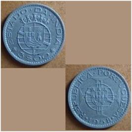 | Description / विवरण | Coin 3 Escudos Portuguese overseas coin currency 3 Escudos for ESTADO DA INDIA minted in nickel with silver reliefs. Obv Denomination 3 SOO,Portuguese National emblem with monogram and busts of King and Queen, clockwise legend EASTADO DA INDIA. Rev Portuguese National Emblem with a monogram and symbol of Holy - cross, clockwise legend REPUBLICA PORTUGUESA with year of minting 1958 |