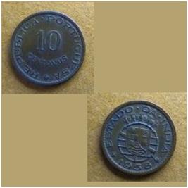 | Description / विवरण | Coin 10 Centavas Portuguese overseas coin currency 10 centavas for ESTADO DA INDIA minted in Bronze. Obv Number denomination 10 bold ,centavas at the center and clockwise legend REPUBLICA PORTUGUESA Rev Portuguese National Emblem with a monogram and busts of King &- Queen, clockwise legend Estado da India, the year of minting 1958. |