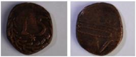 | Description / विवरण | Copper Coin - Denomination is not known. Portuguese overseas coin currency for Estado da India minted in Copper. Obv Royal crown with date and roman number IV. Rev Three intersecting arrows with letters D & B . |