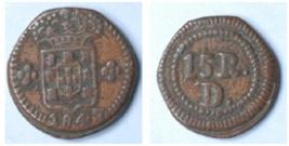 | Description / विवरण | Copper Coin - 15 R Reis . Portuguese overseas coin currency for Estado da India minted in Copper. Obv Denomination 15 R Reis D. Rev Portuguese royal emblem and the year of minting 1847. |