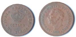 | Description / विवरण | Copper Coin - 1 8 Tanga. Portuguese overseas coin currency for Estado da India minted in Copper. Obv Denomination OitaoTanga with royal crown and clockwise legend - India Portuguesa. Rev Bust of king with clockwise legend Ludovicus I Portug. Et. Algarb - Rex and the year of minting 1886. |