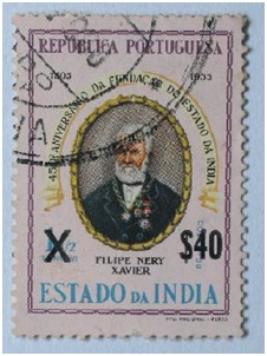 | Description / विवरण | Portuguese overseas stamp forty escudos with bust of Filipe Nery Xavier in the center; value of the stamp 40 on the lower left and legend Republic Portuguesa on top and Estado da India at the bottom. |