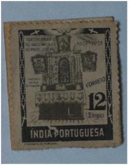 | Description / विवरण | Portuguese overseas postage stamp for Estado da India; 12 Tangas Postage stamp with picture of an altar carring the image of a saint Father- Padre Jose Vaz in a niche and the legend Tricentenario Do Nascime NIO DO Padre Jose Vaz; value of the stamp 12 Tangas on the left corner and - India Portuguesa at the bottom. |