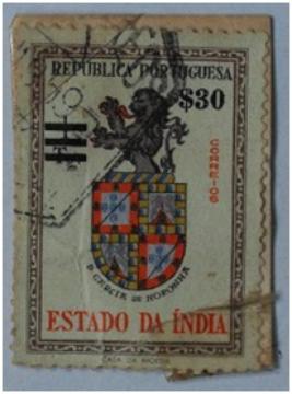 | Description / विवरण | Portuguese overseas postage stamp for Estado da India; 30 escudos Postage stamp with Portuguese emblem carrying a lion; value of the stamp 30 escudos. |