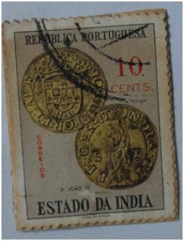 | Description / विवरण | Portuguese overseas postage stamp for Estado da India; 10 Cents. Postage stamp with picture of obverse and reverse sides of a coin with - image of D. Jo o III of Portugal; value of stamp 10 Cents and legend Republica Portuguesa and Estado da India. |