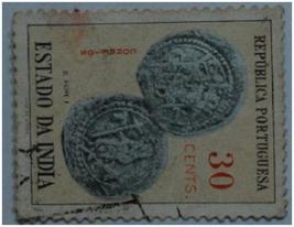 | Description / विवरण | Portuguese overseas postage stamp for Estado da India; 30 Cents. Postage stamp with picture of obverse and reverse views of a coin with figure relief of king Filipe I; value of stamp 30 Cents and legend Republica- Portuguesa and Estado da India. |