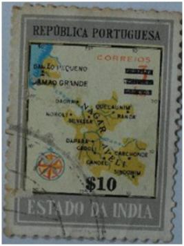 | Description / विवरण | Portuguese overseas postage stamp for Estado da India; 10 Escodo Postage stamp with map of Portuguese settlements in India with a wheel motif and legend Republica Portuguesa, Estado da India; value of the stamp 10 and correios. |