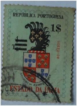 | Description / विवरण | Portuguese overseas postage stamp for Estado da India; 1 Escodo Postage stamp with picture of Portuguese national emblem and legend - Republica Portuguesa, Estado da India; value of the stamp 1 and correios |
