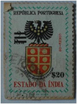 | Description / विवरण | Portuguese overseas postage stamp for Estado da India; 20 Escudos Postage stamp with picture of Portuguese National Emblem with name of D Francisco de Almeida and legend Republica Portuguesa, Estado da In- dia; value of the stamp 20 |