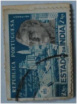 | Description / विवरण | Portuguese overseas postage stamp for Estado da India; 2 Tangas Postage stamp with picture of a port city Lisbon and bust of Pa. Fr. - Manuel Da Mobrega; Jesuit emblem HIS with cross on lower right corner and value of stamp 2 Tangas on lower left corner |