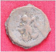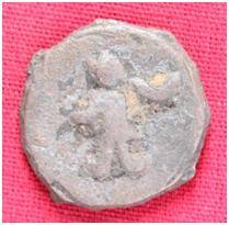 | Description / विवरण | The Shape of the Coin is Circular. Obverse A Standing figure of Kushana type king, with extended right hand and uplifted left hand, wears boots and tunic. Reverse Probably a standing figure of MAO or Moon-God with extended right hand and left hand is not visible, the crescent above the left shoulder. |