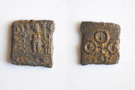 | Description / विवरण | On the obverse Goddess standing with makar in upper left hand and right hand on akimbo, in her right side wheel is depicted. On the reverse one orbed Ujjayani symbol, makar in each orb is depicted. |