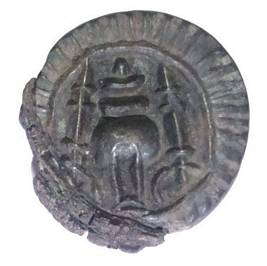 | Description / विवरण | Lot No. 6 1984, 10 Circular coin. Obverse Lion facing right with mouth open. Fore paw raised. Tail uplifted and curved. Srivatsa symbol above the animal, a crescent above the animal and whole device is enclosed in a dotted circle. Reverse A kalasa on a stand flanked by two lamp stands with in a rayed circle. |