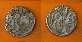 | Description / विवरण | Descrpn./Obv Recumbent bull facing left, wearing jhula (saddle cloth), with trisula (trident) symbol on rump. Above, legend in Sarada script Sri Samantadeva . Descrpn./Rev Rider with lance on caparisoned horse facing right. On left, Sarada letter bhi and on right, Sarada letter ta |
