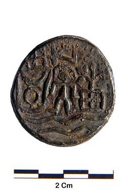 | Description / विवरण | Obverse- Human figure standing in the centre, tree in railing on the right, tourine on the left, Jayadhvaja in railing at the top. Below two wavy lines. Reverse- Obliterated. |
