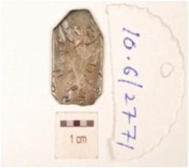 | Description / विवरण | A punch mark silver coin, rectangular shape, having sun, bull, brahmi ma and floral pattern on obverse side, plant motif on reverse side with cutting edge. |