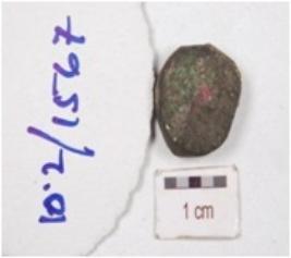 | Description / विवरण | A copper coin with faded motifs on both sides and corroded surface. |