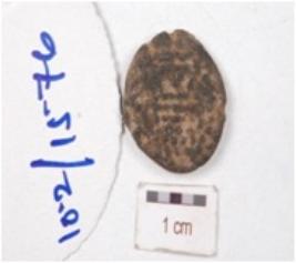 | Description / विवरण | A copper coin with faded motifs on both sides and corroded surface. |