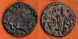 | Description / विवरण | Descrpn./Obv Recumbent bull facing left, wearing jhula (saddle cloth), with trisula (trident) symbol on rump. Above, legend in Sarada script Sri Samantadeva . Descrpn./Rev Rider with lance on caparisoned horse facing right. On left, Sarada letter bhi and on right, Sarada letter ta |