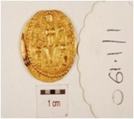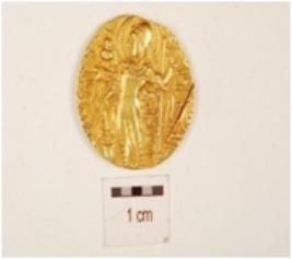 | Description / विवरण | A circular gold coin has a sitting female figurine on throne and male standing figurine on obverse and reverse respectively with legends on both sides. |