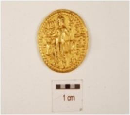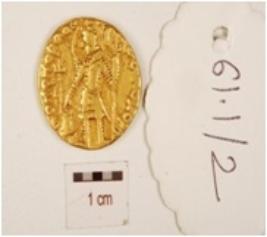 | Description / विवरण | A circular gold coin has a standing male figurine with bull and other attributes on obverse and standing male with legends on reverse. |