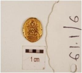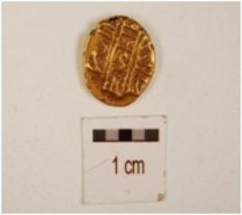 | Description / विवरण | A small circular gold coin, seated deity on obverse and legends on reverse . |