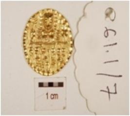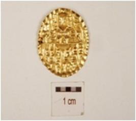 | Description / विवरण | A gold coin has deity like image ,designs and legends on both sides. |