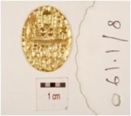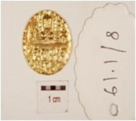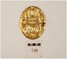 | Description / विवरण | A gold coin has deity like image and legends on both sides. |