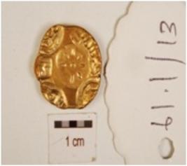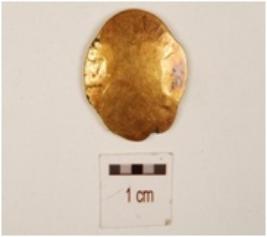 | Description / विवरण | A gold, punch marked coin has floral motifs,legends and other designs on obverse and plane reverse. |