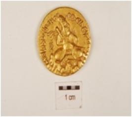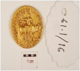 | Description / विवरण | A circular gold coin with a seated male playing a sitar on obverse and an image of male sitting on a bull on reverse.Coin has legend on both sides. |