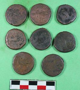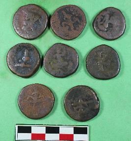 | Description / विवरण | Round shape coin depicting king sitting on couch in easy position on obverse, and sun God MIOPO on reverse. This coin was circulated in the reign of Huvishka. |