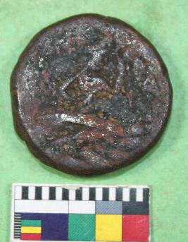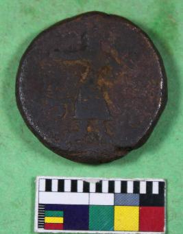 | Description / विवरण | Round shape coin depicting king sitting on couch in easy position on obverse, and Deity AOPO on reverse. This coin was circulated in the reign of Huvishka. |