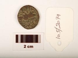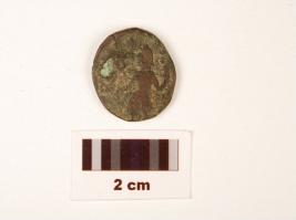 | Description / विवरण | A small thin copper coin, round in shape, cutting marks on edges, human figures are dipicting on reverse and obverse sides, but worn out, formation of patina is visible on surface. |