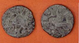 | Description / विवरण | Descrpn./Obv Recumbent bull facing left, wearing jhula (saddle cloth), with trisula (trident) symbol on rump. Above, legend in Sarada script Sri Samantadeva . Descrpn./Rev Rider with lance on caparisoned horse facing right. On left, Sarada letter bhi and on right, Sarada letter ta |