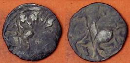 | Description / विवरण | Descrpn./Obv Recumbent bull facing left, wearing jhula (saddle cloth), with trisula (trident) symbol on rump. Above, legend in Sarada script Sri Samantadeva . Descrpn./Rev Rider with lance on caparisoned horse facing right. On left, Sarada letter bhi and on right, Sarada letter ta |